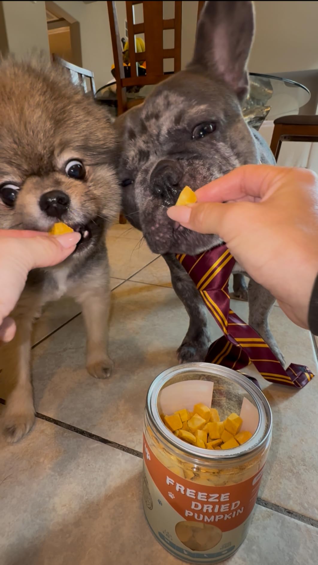 These freeze-dried pumpkin treats have been a huge success with my dog pack! My teacup Pomeranian, puppy French bulldog, and my elderly French bulldog all love them, both as treats and as meal toppers. They’ve worked great as training rewards and I’ve noticed they really help with digestion, too.